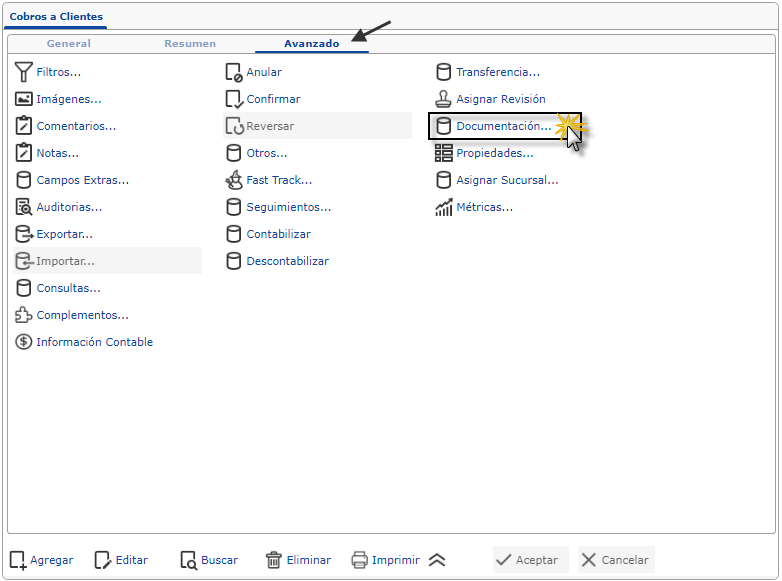 a. Al haber seleccionado el sub. componente Cobros a Clientes se muestra su pantalla en donde nos ubicaremos en la ficha Avanzado y procedemos a seleccionar el botón