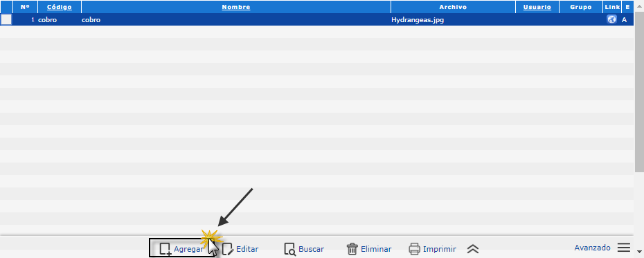 c. Después se procede a llenar los siguientes datos: Tipo, Nombre, Archivo, Usuario, Grupo, Prioridad, Nivel, Comentario, Registro, Clase, Adicional y Origen, luego seleccionaremos el botón
