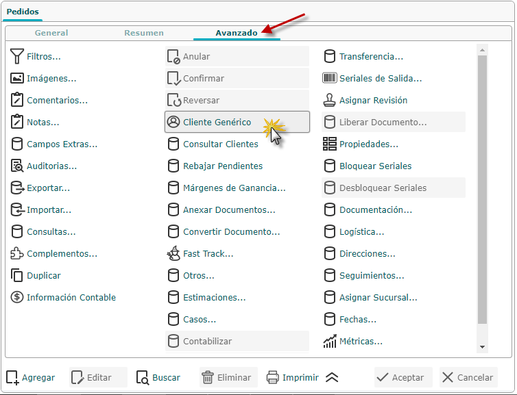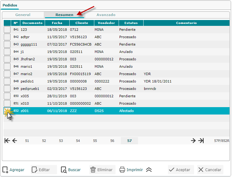 a. Para buscar un pedido nos ubicamos en la pantalla que se muestra al seleccionar el sub. componente Pedidos en la ficha Resumen y buscaremos el pedido que deseamos consultar para asignar los datos de un cliente genérico sin necesidad de registrarlo en el sistema, si no lo vemos allí seleccionaremos el botón