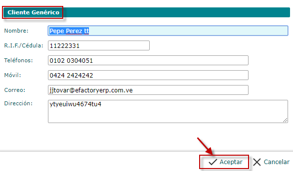 Al terminar de completar los datos del Cliente Genérico se procede a seleccionar el botón