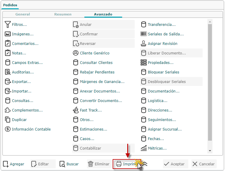de Formato de Pedidos de Clientes y luego el botón