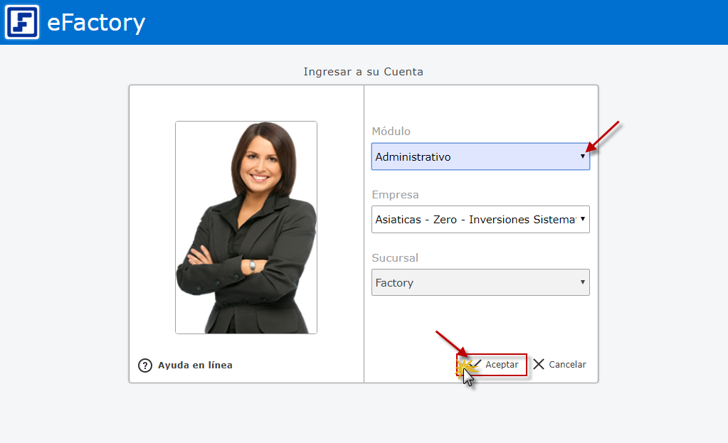 a. Para iniciar en eFactory tenemos que ingresar con nuestro Usuario y Contraseña y seleccionar el botón