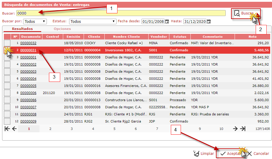 donde se muestra un listado de las notas de entregas cargadas en el sistema, donde seleccionaremos el