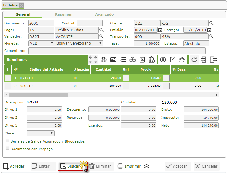 para buscar el pedido que deseamos convertir en una Factura de Venta.