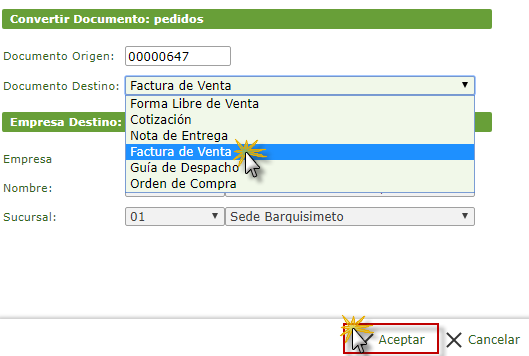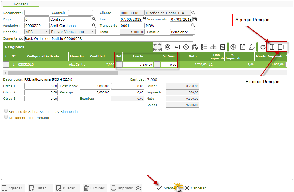 NOTA: Al eliminar un renglón en el momento de convertir el pedido a una Factura de Venta su estatus en pedido queda afectado al momento de confirmar la Factura de Venta ya que unos de su renglones al convertir a factura de venta fue eliminado.
