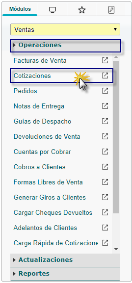 b. En el módulo Ventas, desplegamos el componente Operaciones y activamos el sub componente Cotizaciones