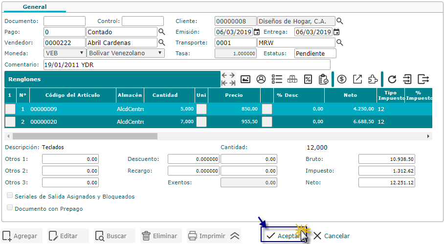 c. Luego se nos carga la ventana de Nota de Entrega donde podremos agregar, y eliminar reglones y modificar el campos vendedor, después de haber realizado todas estas operaciones se procede a seleccionar el botón