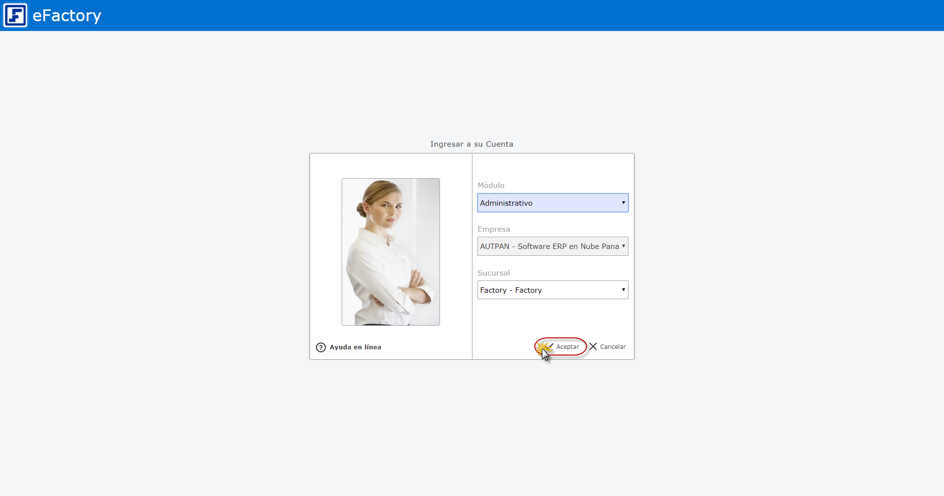 Primero debemos ingresar al sistema de eFactory colocando nuestro usuario y contraseña en la pantalla inicial de eFactory, luego presionaremos el botón de "Iniciar Sesión" y seleccionaremos el sistema de "Administrativo",
