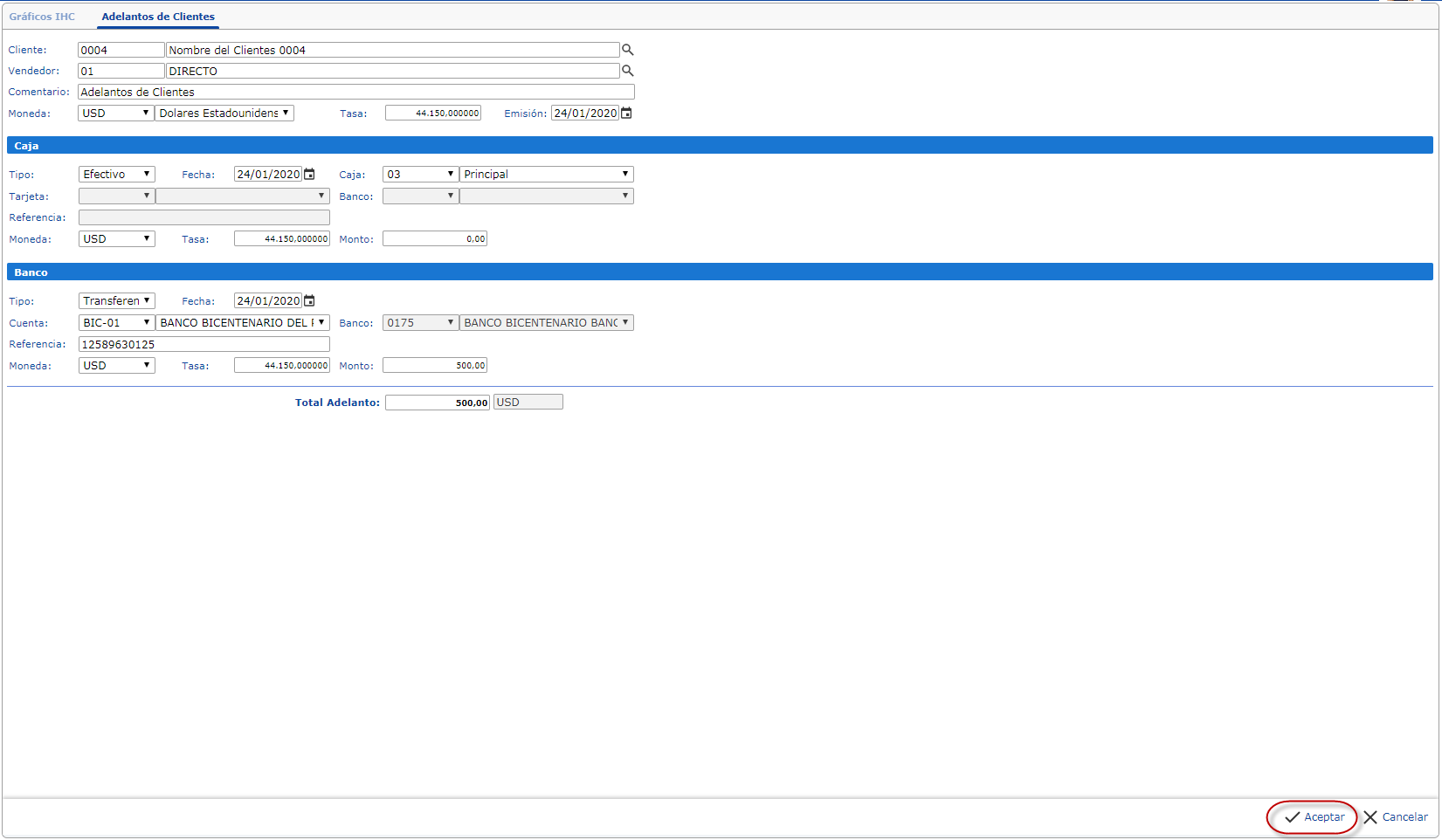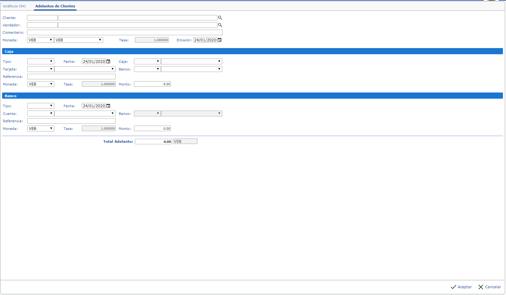 Seguidamente se abrirá el panel de Adelantos de Clientes, este panel está dividido en tres secciones: General, Caja y Banco. Cada una de estas secciones tiene un grupo de campos a llenar, a continuación le explicamos detalladamente como llenar correctamente cada uno de ellos.