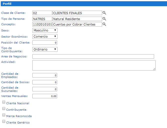 En esta sección, deben completarse obligatoriamente los siguientes campos: Clase de cliente,tipo de persona, concepto, sexo, sector económico, y tipo de contribuyente.