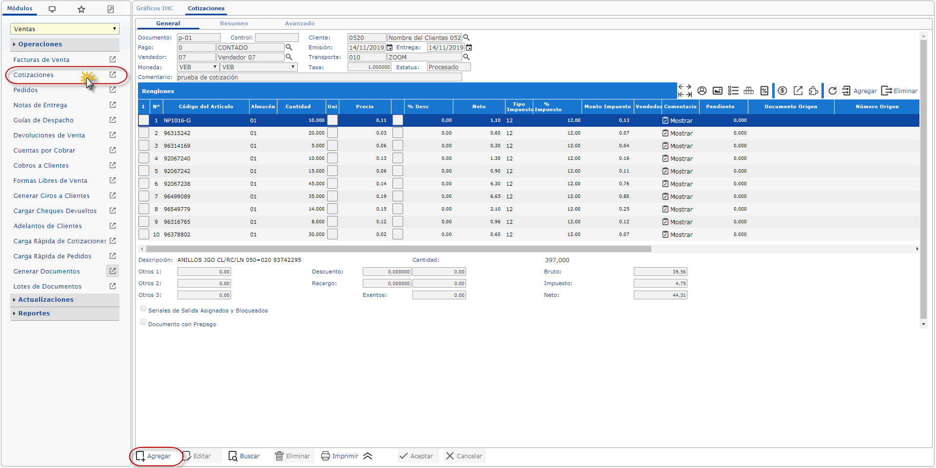 Allí te aparecerá una Pantalla en donde debes dar clic en el botón Agregar para crear la cotización.