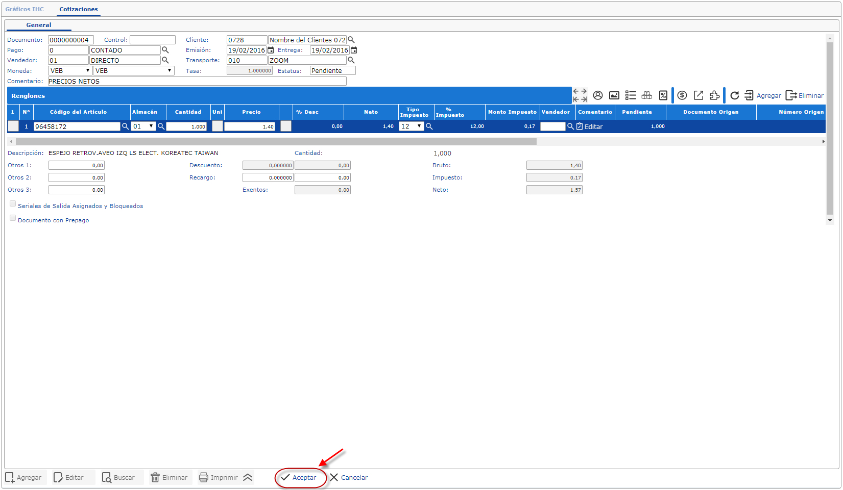 Cuando termines sólo debes dar clic en el botón aceptar y se generará la nueva cotización.