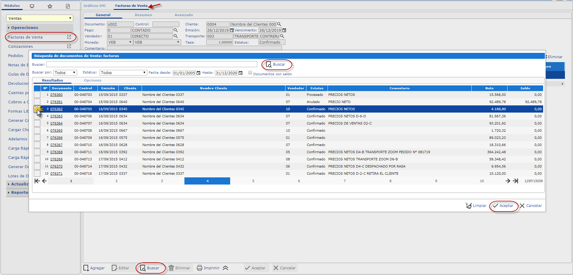 Estando allí puedes seleccionar alguna factura que hayas realizado con anterioridad, haciendo uso del botón