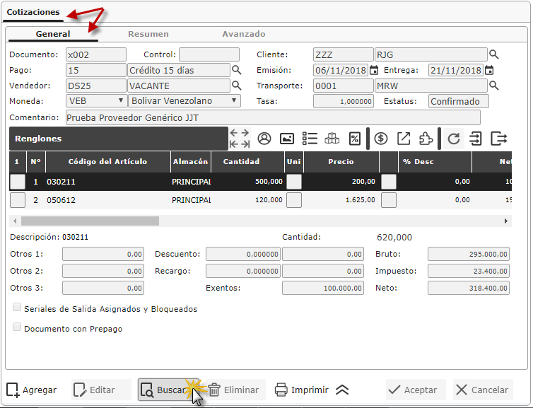 a. Después de haber buscado la Cotización se muestra la pantalla general de esa cotización donde seleccionaremos la ficha Avanzado y procedemos a seleccionar el botón