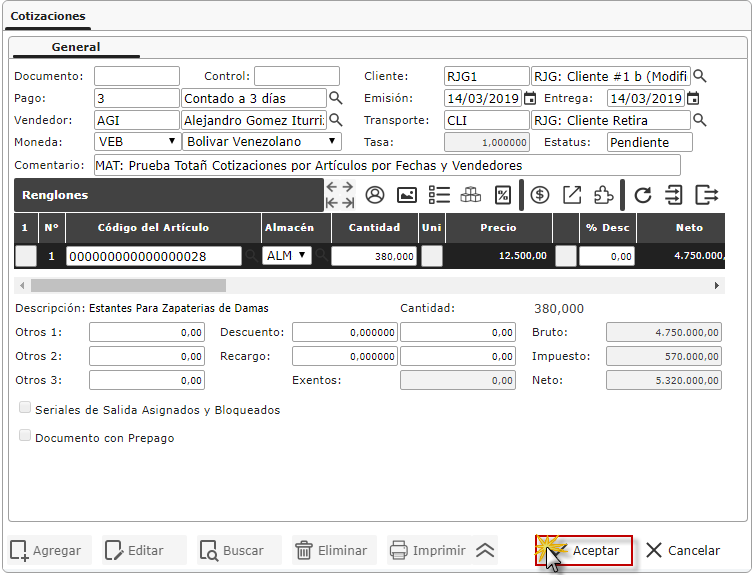 donde se muestra un listado de las Cotizaciones cargadas en el sistema, donde seleccionaremos el
