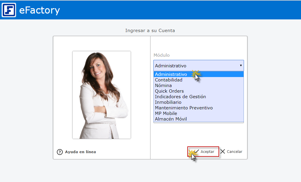 a. Para iniciar en eFactory tenemos que ingresar con nuestro Usuario y Contraseña y seleccionar el botón