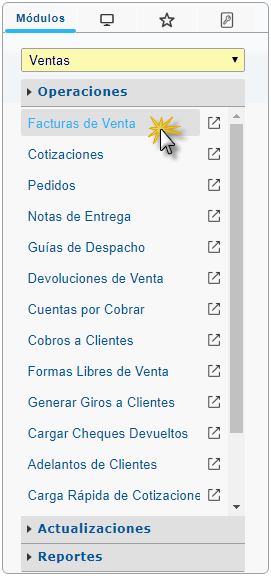 b. En el módulo Ventas, desplegamos el componente Operaciones y activamos el sub componente Facturas de Ventas
