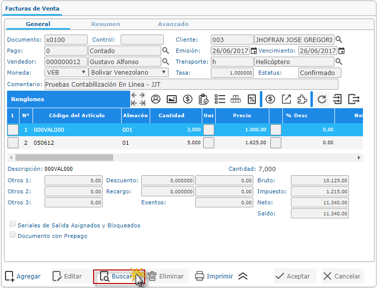a. Después de haber buscado la facturas se muestra la pantalla general de esa facturas donde seleccionaremos la ficha Avanzado y procedemos a seleccionar el botón