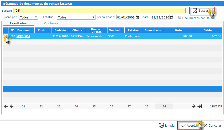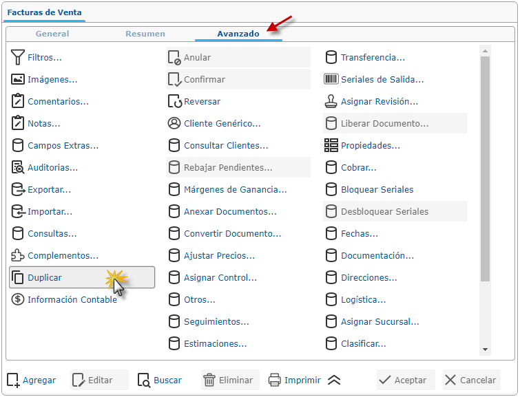 Nota: También podemos ubicarnos en la ficha Resumen y ir buscando la facturas que deseemos duplicar.