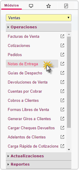 b. En el módulo Ventas, desplegamos el componente Operaciones y activamos el sub componente Notas de Entrega