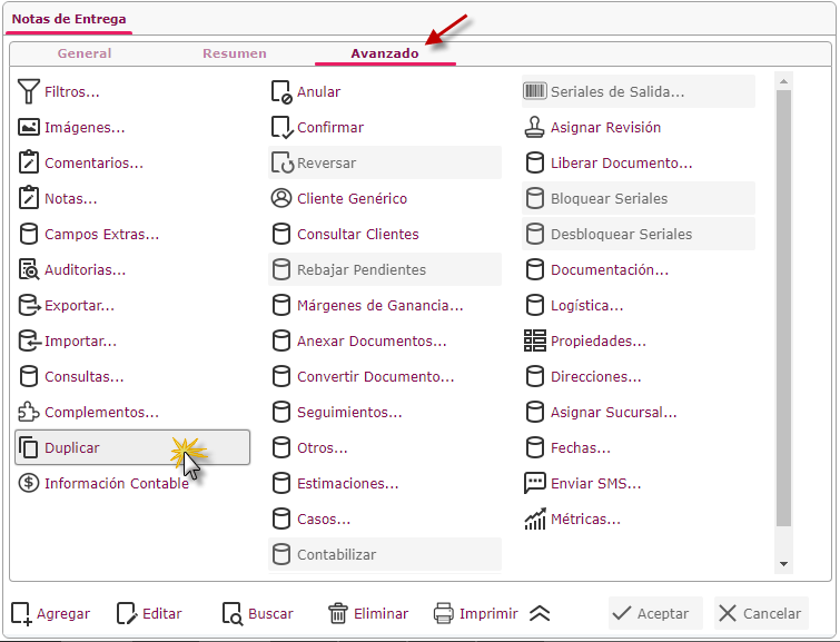 Nota: También podemos ubicarnos en la ficha Resumen y ir buscando la notas de entrega que deseemos duplicar.