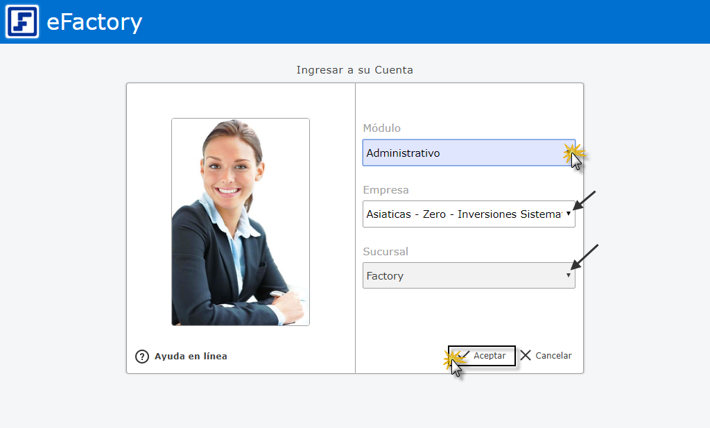 a. Para iniciar en eFactory tenemos que ingresar con nuestro Usuario y Contraseña y seleccionar el botón