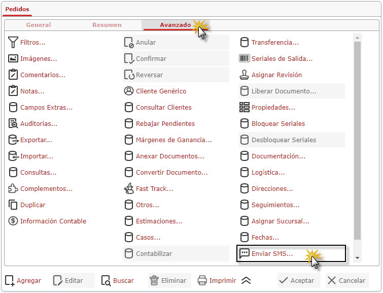 a. Al seleccionar el sub. componente Pedidos se muestra su pantalla donde seleccionaremos la ficha Avanzado y procedemos a seleccionar el botón