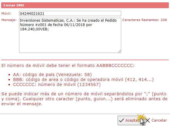 b. Luego observaremos la ventana Enviar SMS donde se procede a llenar el campo Móvil y Mensaje para el envío de SMS en pedidos.