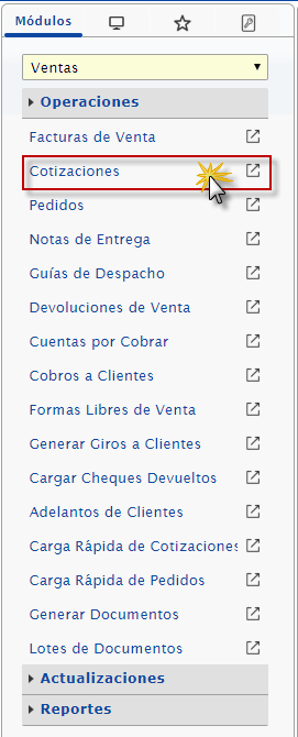b. Después seleccionaremos el módulo Ventas, desplegamos el componente Operaciones y activamos el sub componente Cotizaciones.