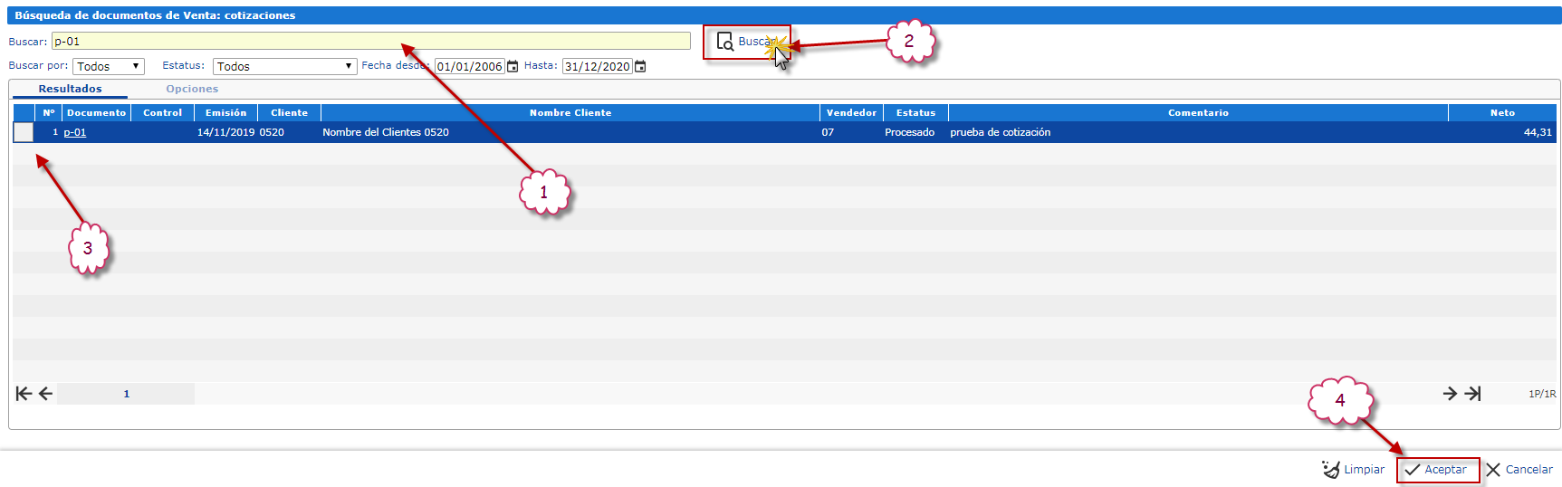 , lo que abrirá una ventana de búsqueda para ubicar la cotización requerida. Los filtros de la ventana de búsqueda permiten que mediante algún datos de la cotización pueda ubicarla solo con presionar el ícono