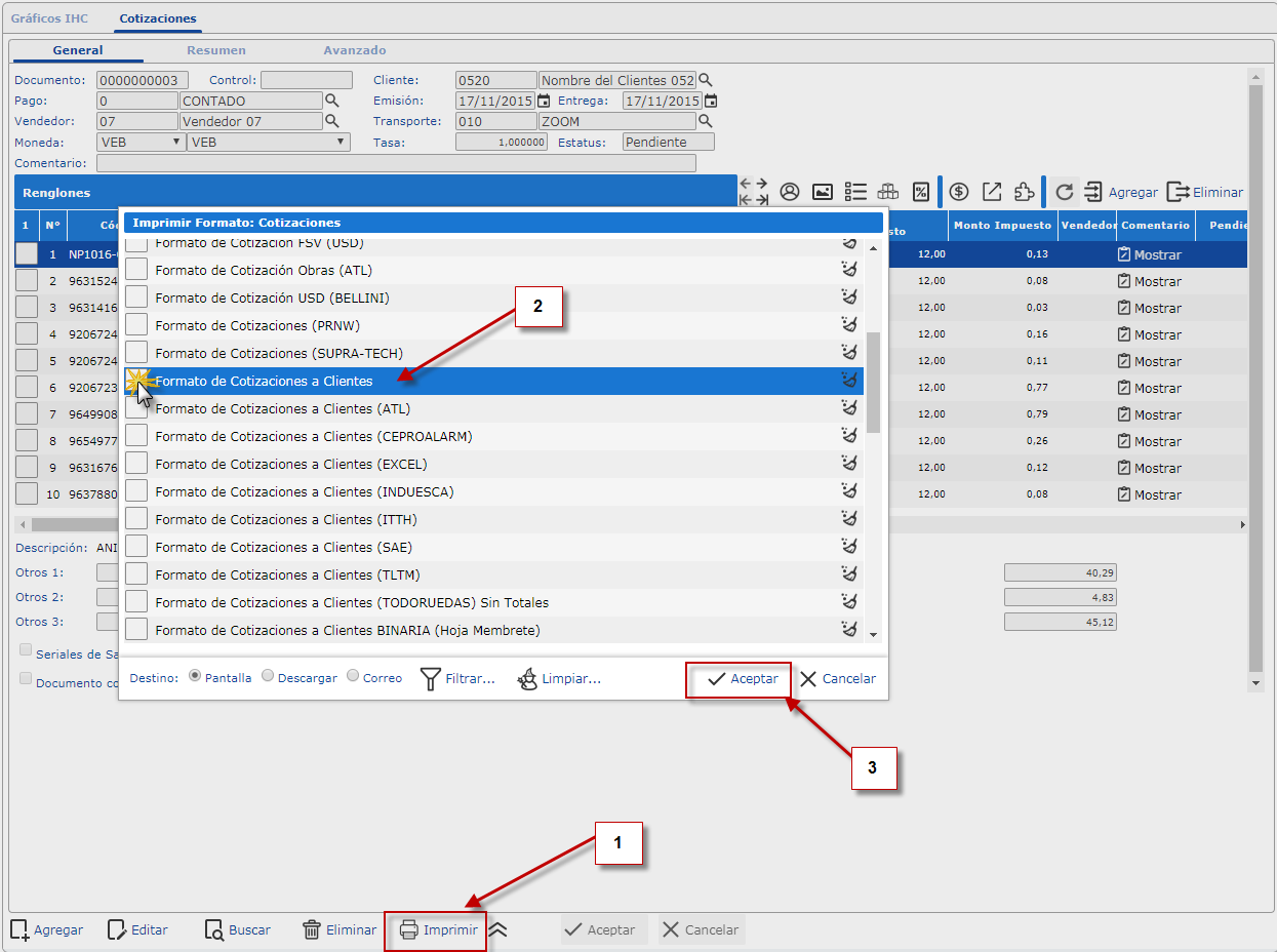 ventana en la cual podremos ver una lista de formatos disponibles seleccionaremos el formato "Formato de Cotizaciones a Clientes"