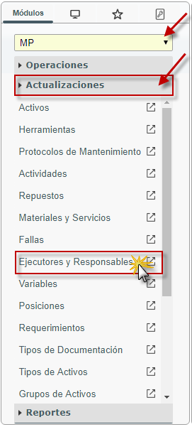b. En el módulo MP, desplegamos el componente Actualizaciones y activamos el sub. componente Ejecutores y Responsables .