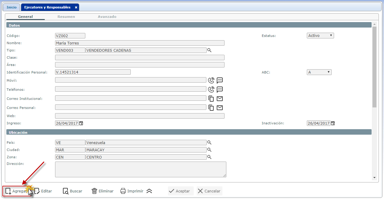 se muestra la ventana donde podemos agregar un Ejecutor y Responsable, donde presionaremos el botón