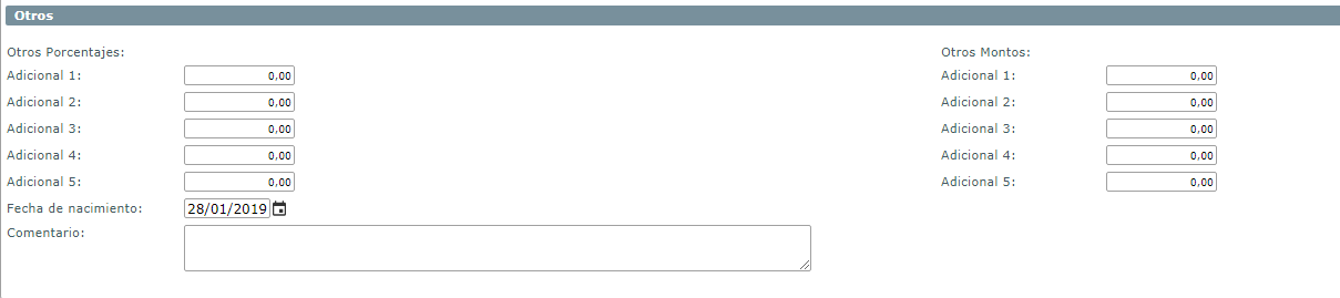e. Luego para compretar la agregación tenemos la Sección Otros, Esta sección se provee para expandir las opciones de asignación de porcentajes y para la definición de otros montos.