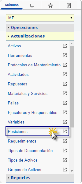 a. Al ingresar en el sistema debemos seleccionar el módulo "MP Mantenimiento Preventivo" y al desplegar la sección de "Actualizaciones" seleccionaremos la opción de Repuestos.