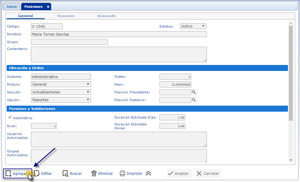 a. Para agregar posición luego de haber seleccionado el sub. componente Posiciones se muestra su pantalla correspondiente donde seleccionaremos el botón