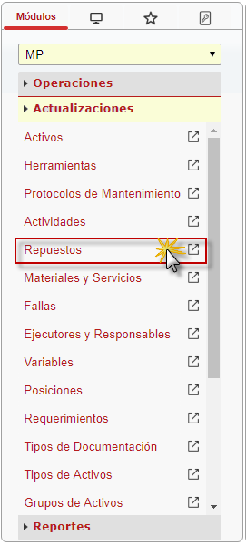 a. Al ingresar en el sistema debemos seleccionar el módulo "MP Mantenimiento Preventivo" y al desplegar la sección de "Actualizaciones" seleccionaremos la opción de Repuestos.