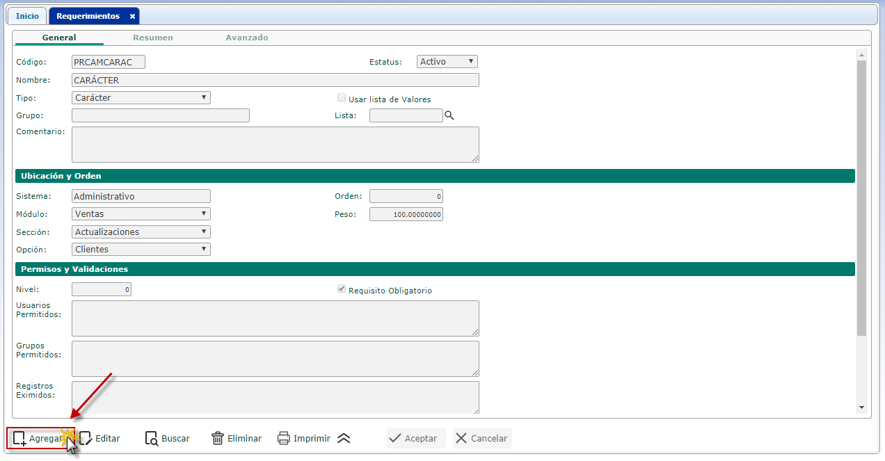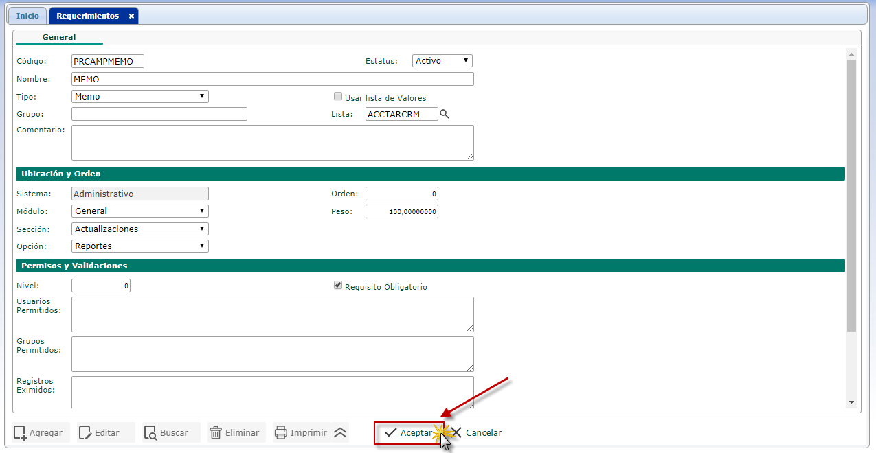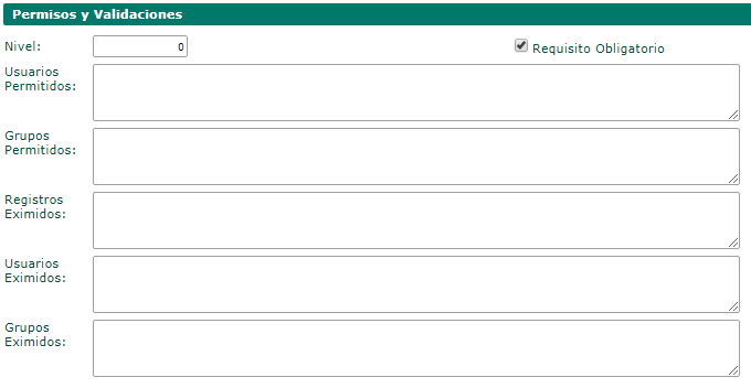 Los siguientes campos que conforma el requerimiento son Nivel, requisitos obligatorio, usuarios permitidos, grupos permitidos, Registros eximidos, Usuarios Eximidos y Grupos Eximidos.