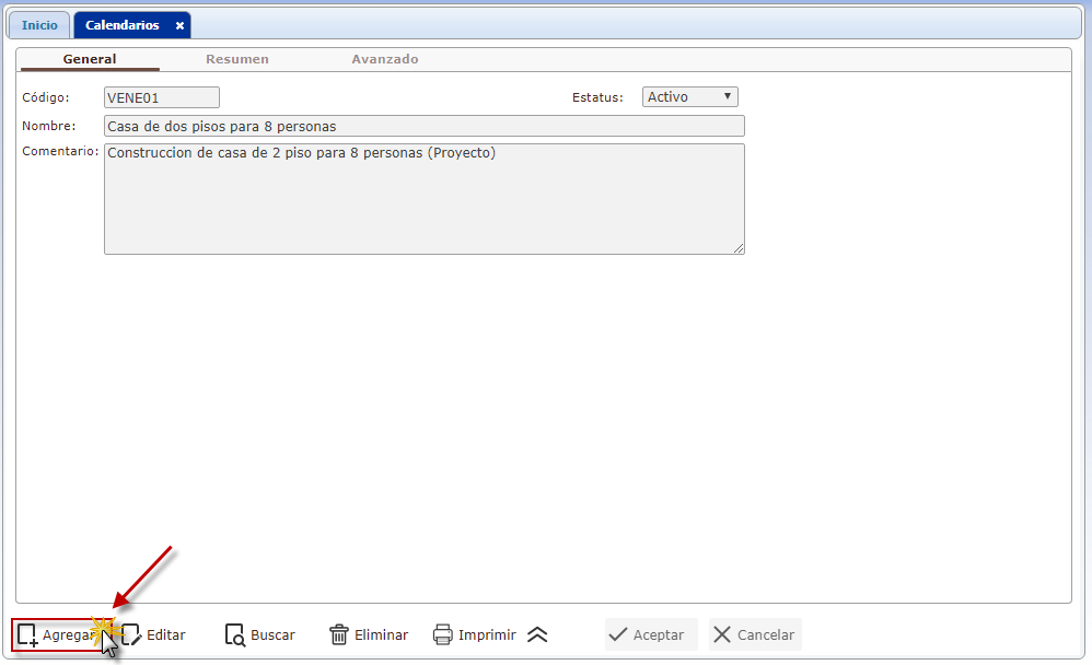a. Para agregar un Calendarios, después de haber seleccionado el sub. componente Calendarios