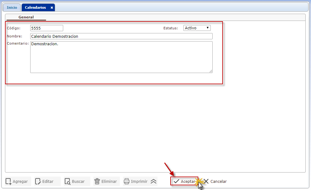 b. Después procedemos a llenar los siguientes campos para la agregar un calendarios: