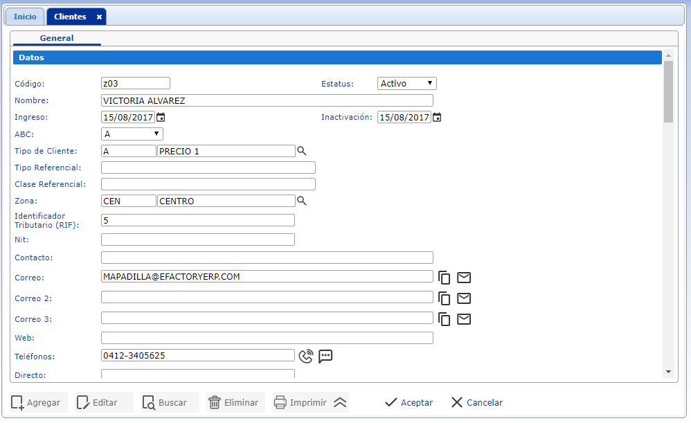 - Estatus: Con el estatus se determina si el cliente estará activo, inactivo o suspendido.