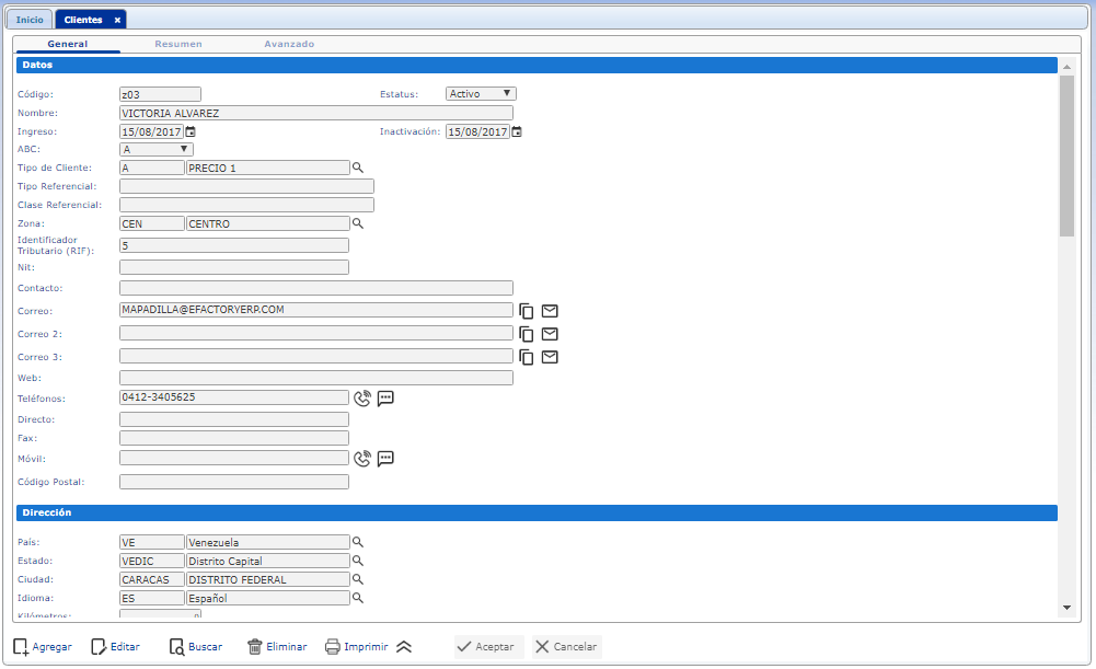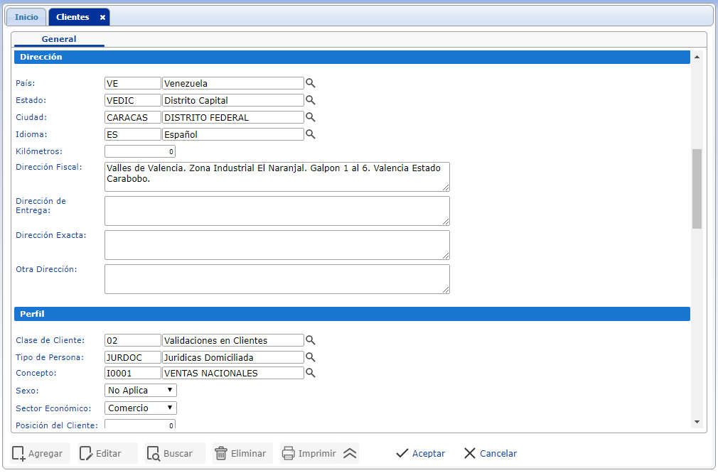 - Sección Dirección: Reservada a la captura de los datos que determinan la dirección fiscal del cliente, la dirección de entrega de productos y direcciones opcionales. A través de esta sección podremos ingresar de forma específica el país, estado y ciudad, determinar el idioma del cliente y kilómetros concretos a recorrer.