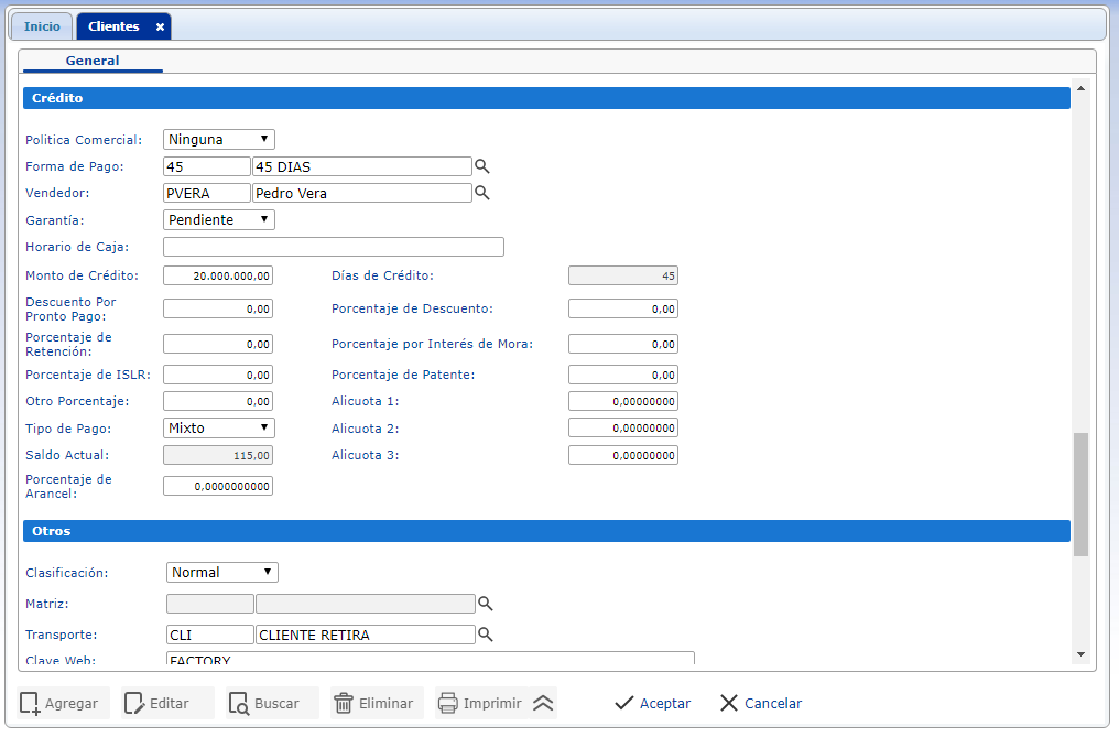 - Sección Crédito: En esta sección se define la política comercial acordada, las formas de pago, los porcentajes de crédito y descuento otorgados, también nos permite controlar el monto de crédito, los días de crédito y saldo actual.