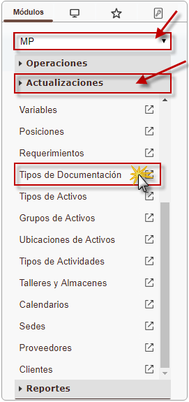 b. En el módulo MP, desplegamos el componente Actualizaciones y activamos el sub. componente Tipos de Documentación.