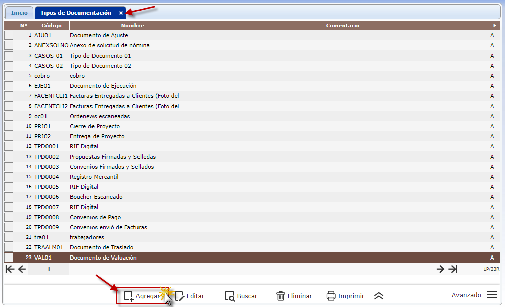 observamos la ventana donde podemos agregar un Tipo de Documentación, donde debemos presionar el botón
