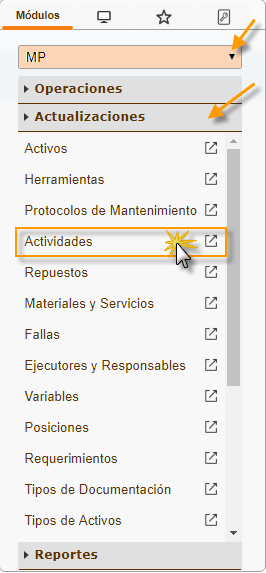 b. En el módulo MP, desplegamos el componente Actualizaciones y activamos el sub. componente Actividades.