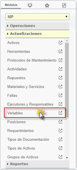 a. Al ingresar en el sistema debemos seleccionar el módulo "MP Mantenimiento Preventivo" y al desplegar la sección de "Actualizaciones" seleccionaremos la opción de Variables.
