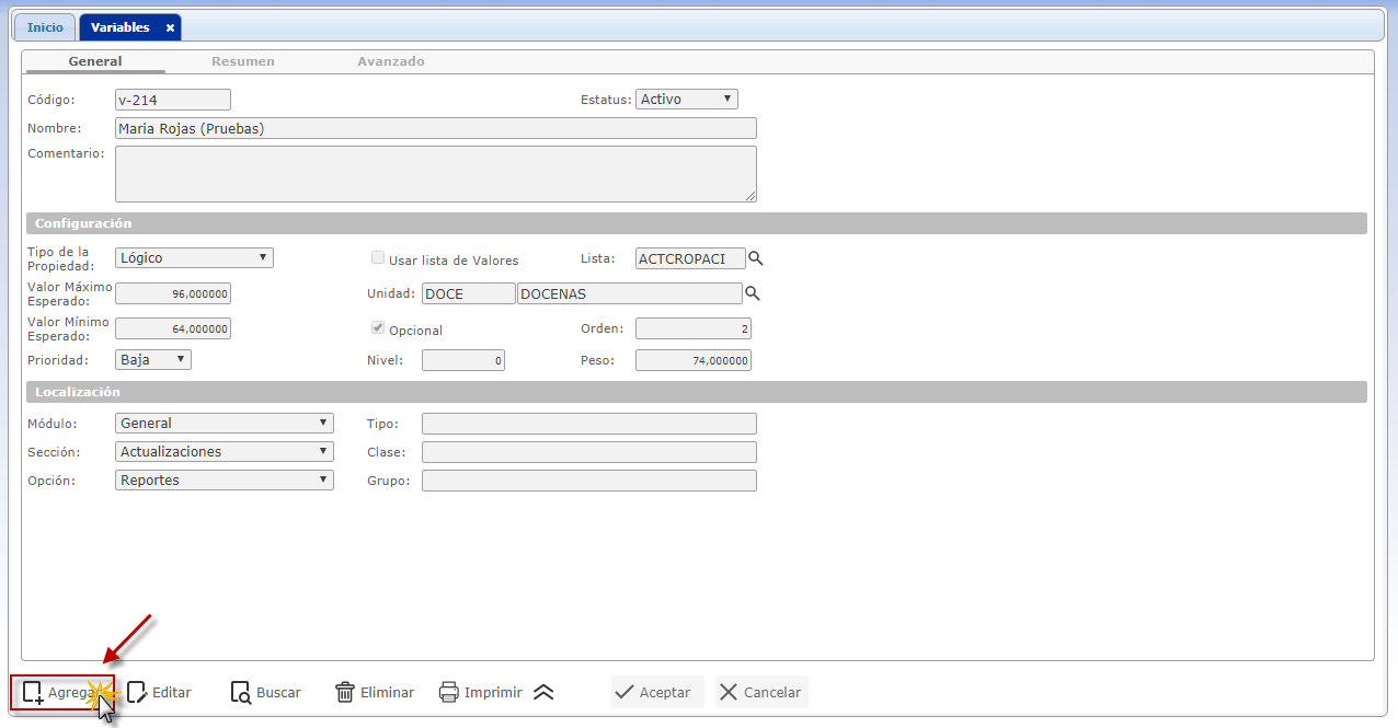 a. Para agregar Variables luego de haber seleccionado el sub. componente Variables se muestra su pantalla correspondiente donde seleccionaremos el botón
