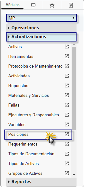 b. En el módulo MP, desplegamos el componente Actualizaciones y activamos el sub. componente Posiciones.