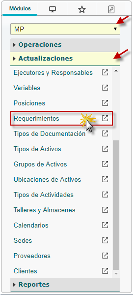 b. En el módulo MP, desplegamos el componente Actualizaciones y activamos el sub. componente Requerimientos.